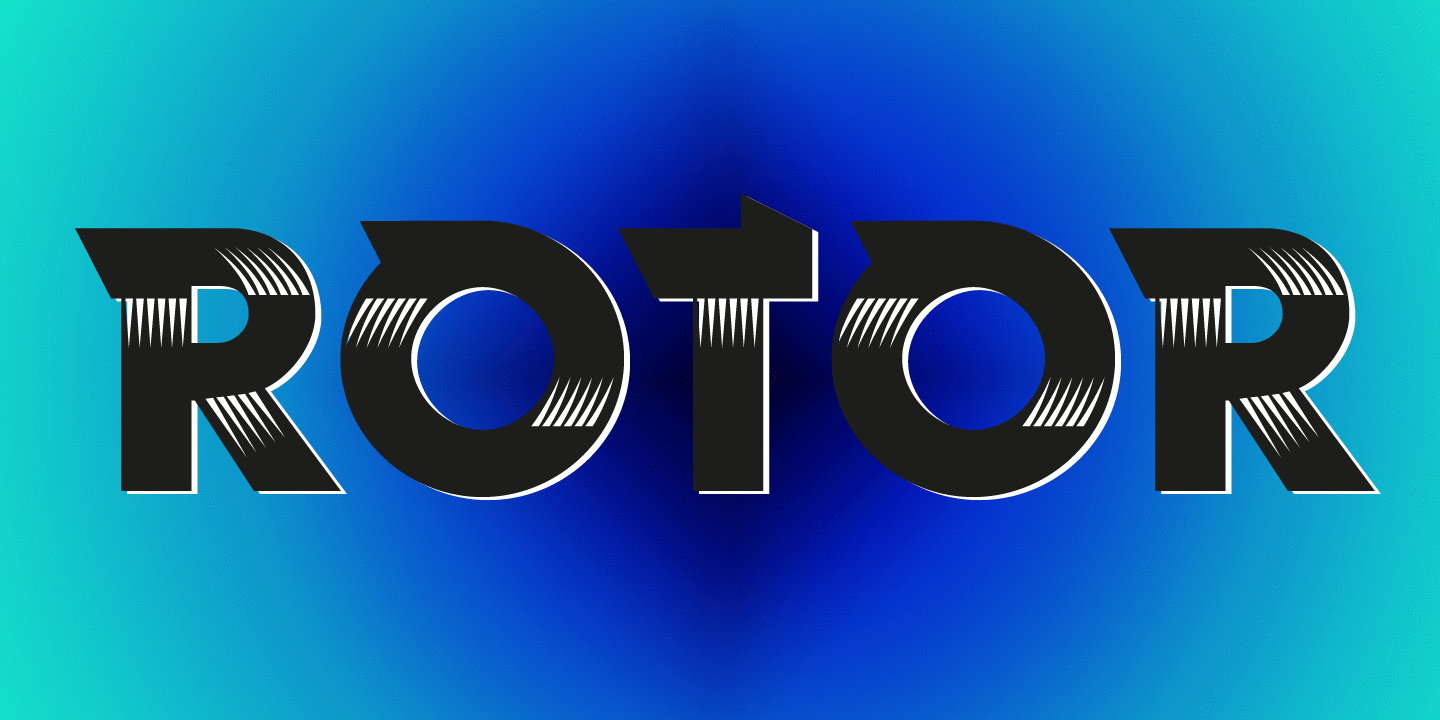 The early Vulcan design inspired me to do »ROTOR«, a new and faster typeface in two different »speeds«, meaning I gave the design two opposing slants on the slab-serifs. To be more useful I drew two sets to make overlays, one with the white speedtraces and one without.